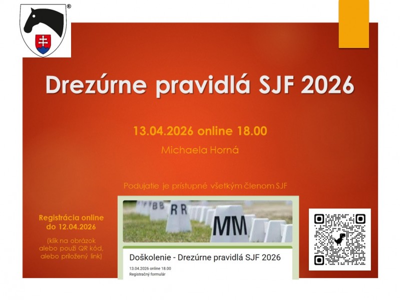 Drezúrna komisia SJF vyzýva reprezentantov, ktorí majú záujem o účasť na Majstrovstvách Európy a Majstrovstvách sveta v drezúre, aby svoj zámer nahlásili najneskôr do 6.6.2024 na michaela.horna@sjf.sk.